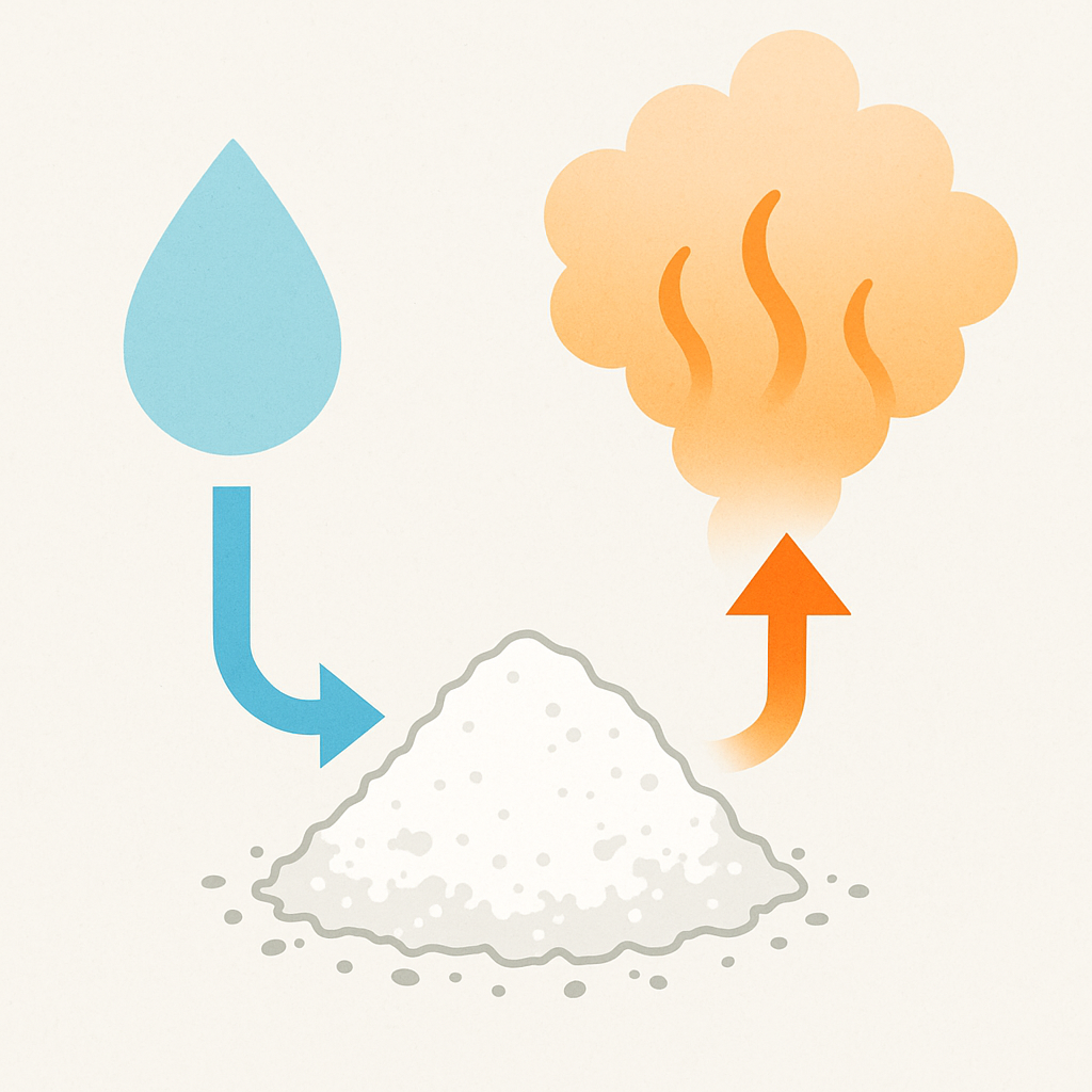 Pull a cord to release the water. When water contacts the quicklime, a chemical reaction occurs: CaO + H₂O → Ca(OH)₂ + heat.